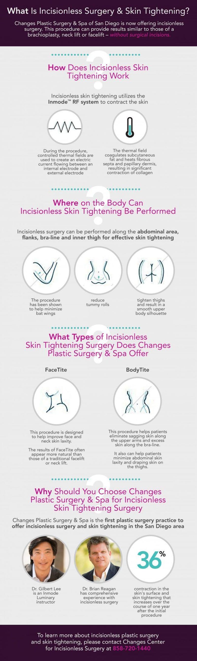 Changes Plastic Surgery & Spa of San Diego is now offering incisionless surgery and skin tightening. Using targeted radiofrequency, patients can now opt to have a number of traditional plastic surgery procedures performed without incisions and without scars. Incisionless options are now available for Brachioplasty (arm lift), neck lift or facelift and even breast and thigh lift – without surgical incisions.